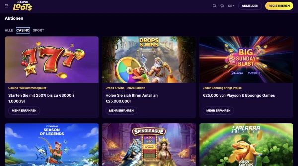 Unser Bonussystem für Deutschland umfasst Casinospiel, Sportwetten, Reload-Prämien, Cashback und Preis-Events. Wir stellen die Bedingungen klar dar, damit Spieler Einzahlungsbetrag, Matchrate und Umsatzanforderungen sehen, bevor sie teilnehmen. Die aktuelle CasinoLoots bonus-Auswahl ist sowohl für neue als auch für wiederkehrende Kunden aufgebaut.