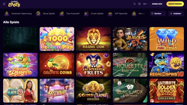CasinoLoots bietet Zugriff auf 12.755 Casinospiele, wodurch die Bibliothek zu den größten Bestandteilen der Plattform zählt. Spieler können aus Slots, Tischspielen, Live Casino, Sport und Live-Sport wählen. Slot-Fans finden klassische Walzen, Video-Slots und featurelastige Titel, während Tischspiel-Nutzer je nach Provider-Angebot zwischen digitalen und Live-Versionen von Spielen wie Blackjack und Roulette wechseln können.