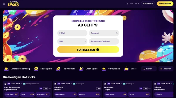 Für deutsche Nutzer hebt sich unser Angebot durch ein dreiteiliges Willkommenspaket, Soforteinzahlungen über viele Methoden und schnelle Auszahlungen per E-Wallet oder Krypto ab. CasinoLoots Casino funktioniert außerdem sehr gut in mobilen Browsern, sodass Spieler ihren Account verwalten und spielen können, ohne Software herunterzuladen. Diese Startseite erklärt, wie Registrierung, Boni, Spiele, Zahlungen, Sicherheit und Support bei Casino CasinoLoots Deutschland funktionieren.