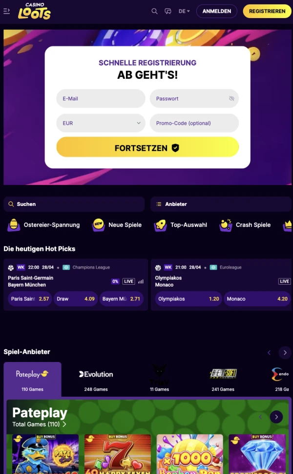 Unsere mobile Plattform bietet Nutzern die wichtigsten Tools für Echtgeldspiel an einem Ort. CasinoLoots Casino unterstützt sicheres Browsen, schnellen Kontozugriff und reibungsloses Laden von Spielen auf mobilen Bildschirmen. Für Spieler aus Deutschland bedeutet das: Sie wechseln mit klaren Schritten und stabiler Performance von der Registrierung über Einzahlungen und Gameplay bis hin zu Auszahlungen.